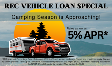 If you've been thinking about upgrading or buying a new camper or travel trailer, now is the time! With our Recreational Vehicle Loan Special, you can finance a new camper with rates as low as 5% APR. Affordable... read more >