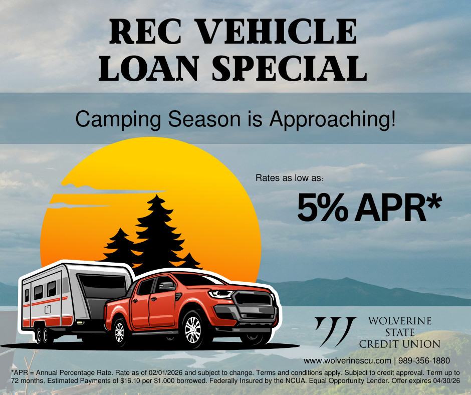 If you’ve been thinking about upgrading or buying a new camper or travel trailer, now is the time! With our Recreational Vehicle Loan Special, you can finance a new camper with rates as low as 5% APR. Affordable payments with terms up to 72 months. Start planning your next camping season and let us handle the financing.